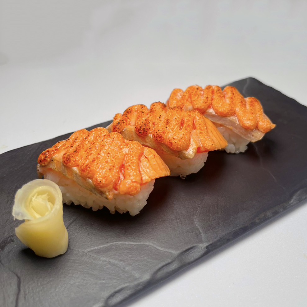 A Sushi featuring a slice of salmon that is lightly broiled (Aburi style), topped with a creamy and spicy Mentaiko (marinated cod roe) sauce, served over vinegared rice. The combination of smoky salmon and the rich, tangy roe makes for a flavorful bite.