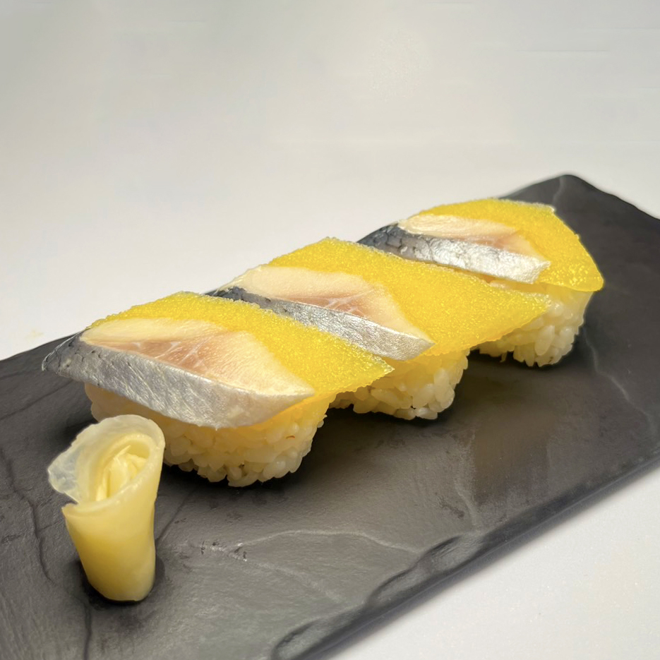 A unique Sushi topped with a slice of herring filled with tiny fish eggs (roe), offering a savory, slightly salty flavor and a distinctive crunchy texture from the roe, served over vinegared rice.