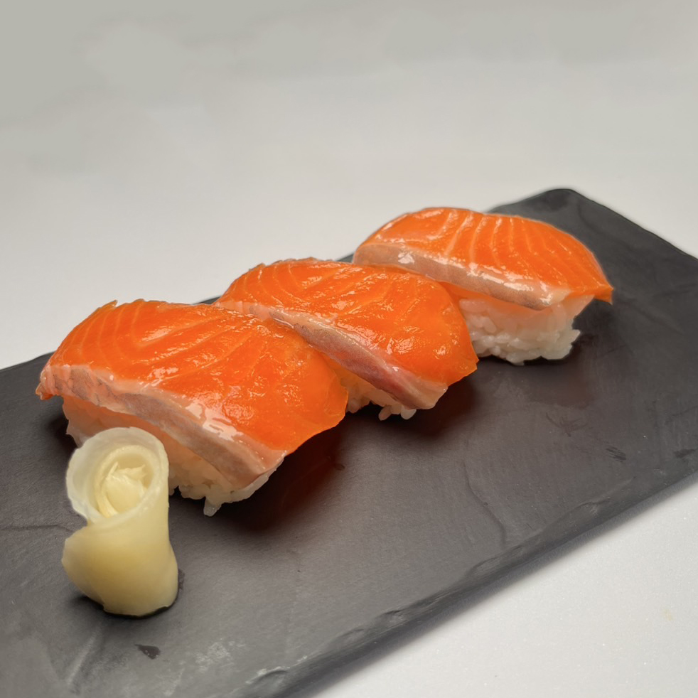 A popular Sushi made with a slice of buttery, rich raw Japanese salmon placed on top of vinegared rice, known for its smooth texture and mild flavor.