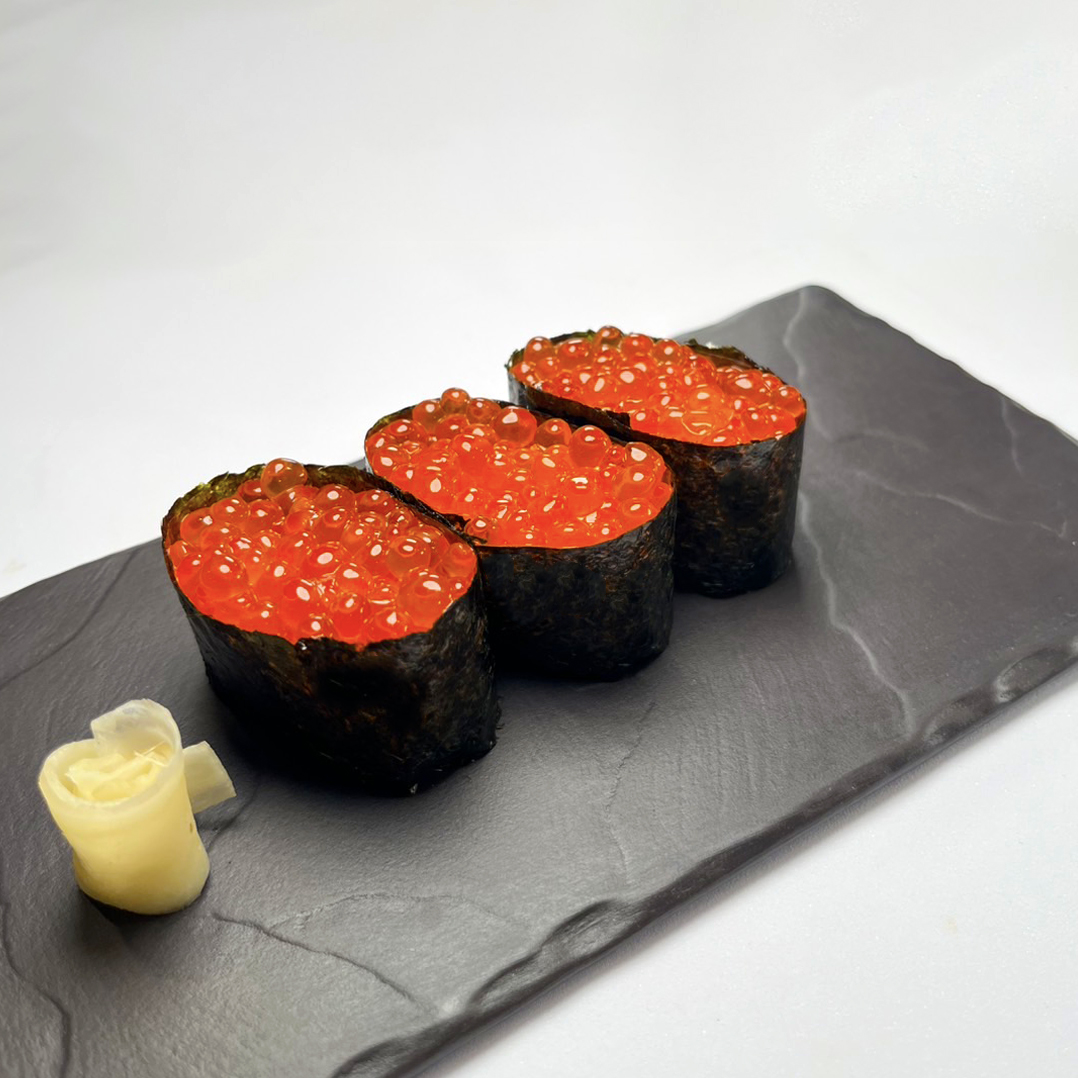 A type of Sushi where a mound of vinegared rice is wrapped in a sheet of Nori (seaweed) and topped with vibrant, briny salmon roe (Ikura), offering a burst of flavor with each bite.