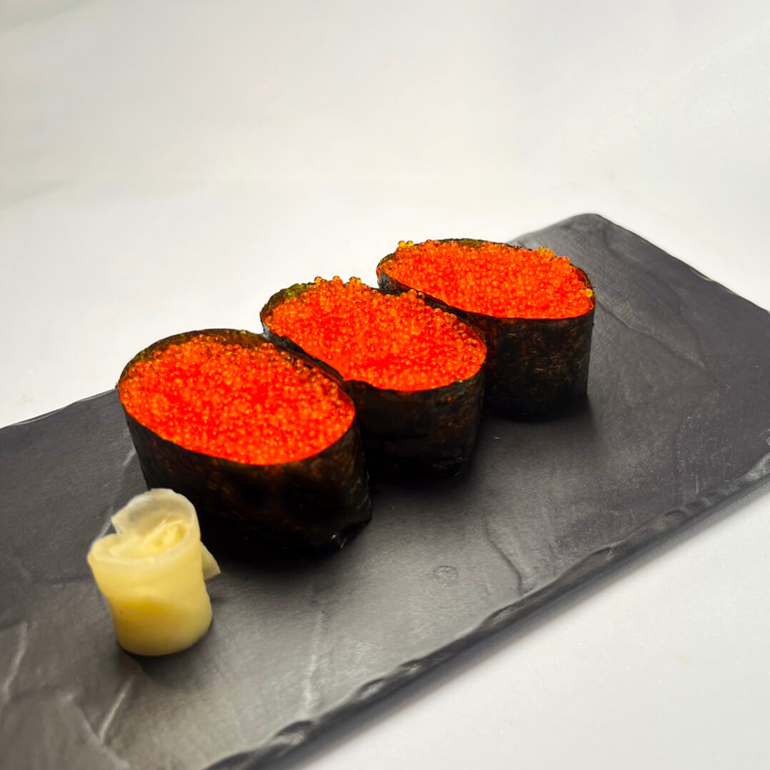A Sushi where vinegared rice is wrapped in a seaweed sheet (Nori) and topped with crunchy, colorful fish roe (Tobiko), typically from flying fish, providing a pop of salty flavor and texture.