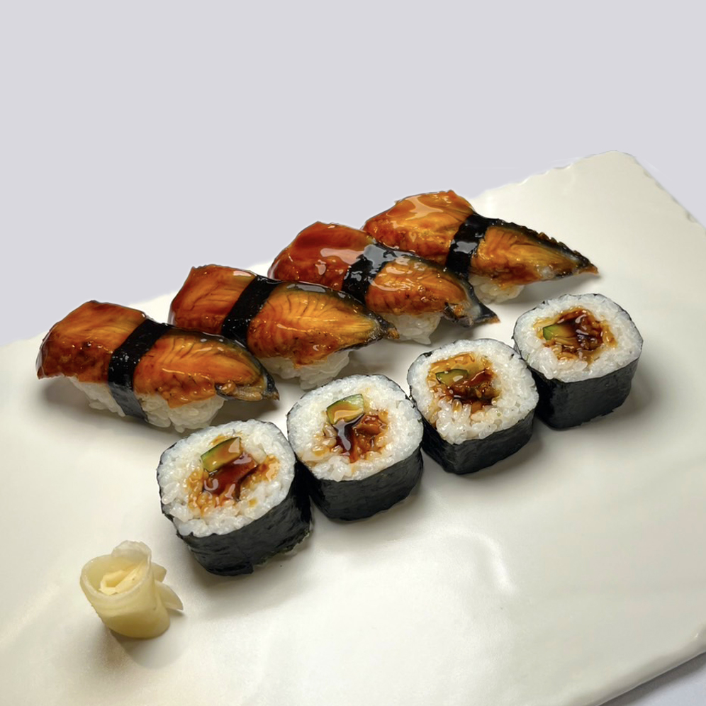 A flavorful Sushi set combining grilled eel (Unagi) and specialty rolls. The unagi is typically glazed with a sweet soy-based sauce, while the rolls feature a variety of fillings, including eel and cucumber offering a harmonious blend of smoky, savory, and creamy flavors.